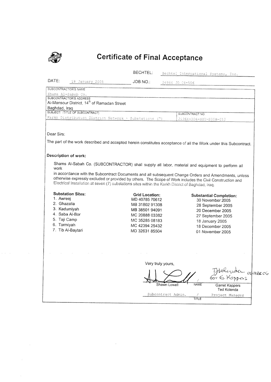 Private Iraqi Company specialized in supplying and installing power generation plants, Substations and O.H.L. including the following activities:
